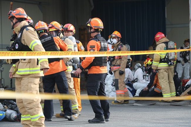 28일 오후 부산 사상구 감전동 폐수처리업체에서 황화수소로 추정되는 물질이 누출된 현장에 소방대원들이 사고 수습을 하고 있다.