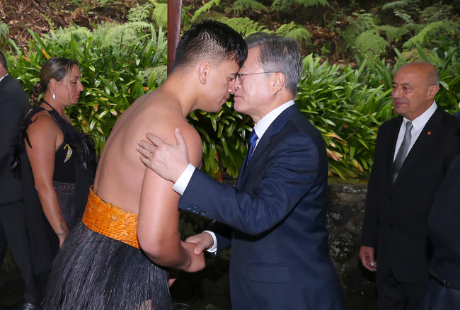 뉴질랜드를 국빈 방문한 문재인 대통령이 3일 오전 뉴질랜드 오클랜드 총독 관저 대정원에서 열린 공식 환영식에서 마오리족 공연자 대표와 악수하면서 코를 부드럽게 맞대는 마오리족 전통 인사인 '홍이(hongi)' 인사를 하고 있다.