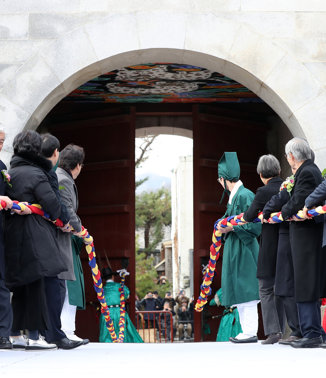 6일 서울 경복궁에서 영추문 개방행사가 열렸다. 영추문은 조선시대 문무백관이 주로 출입한 문으로 연추문이라고도 불린다. 임진왜란 때 소실됐다가 19세기 중반 경복궁이 중건되면서 다시 지어졌다. 이후 192년 전차 노선이 만들어진 뒤 석축이 무너지면서 철거됐고 1975년에 다시 세웠다.