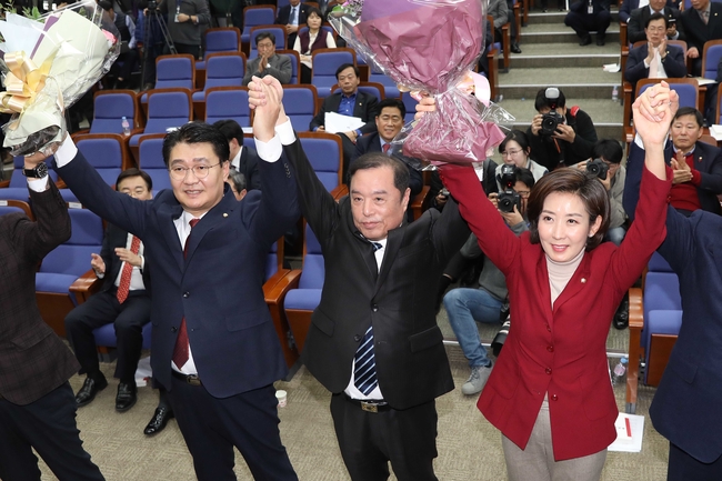 11일 오후 국회에서 열린 자유한국당 새 원내대표·정책위의장 선출을 위한 의원총회에서 새로운 원내대표로 선출된 나경원 의원이 당 지도부와 손을 맞잡고 있다. 나경원 신임 원내대표(사진 오른쪽부터 왼쪽으로), 김병준 비대위원장, 정용기 신임 정책위의장.