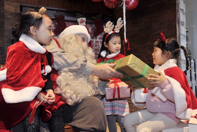 20일 오전 서울 광진구 워커힐호텔 '산타의 캐빈' 포토존에서 핀란드 공인 산타와 어린이들이 포즈를 취하고 있다.