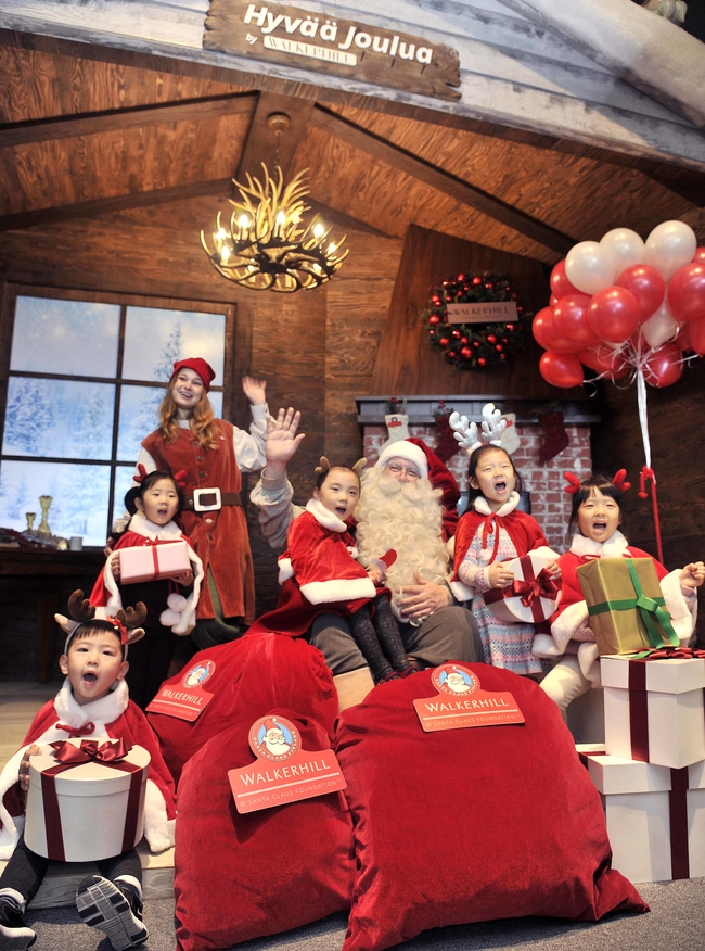 20일 오전 서울 광진구 워커힐호텔 '산타의 캐빈' 포토존에서 핀란드 공인 산타와 어린이들이 포즈를 취하고 있다.