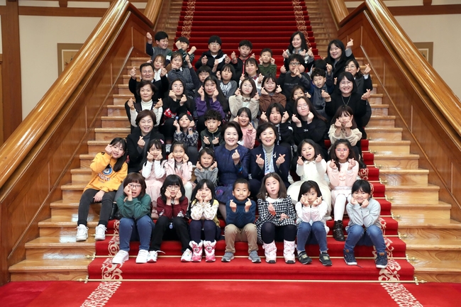 김정숙 여사가 20일 청와대에 서광지역아동센터 아동을 초대해 기념 촬영을 하고 있다.