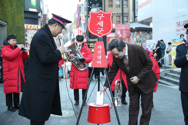 이낙연 국무총리가 24일 오후 서울 명동을 방문해 구세군 자선냄비 모금함에 성금을 넣고 있다.