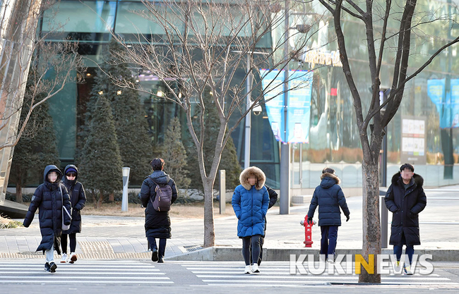 전국적으로 한파가 몰아친 28일 오전 서울 상암동 DMC에서 시민들이 두꺼운 옷차림으로 출근하고 있다. 오늘 서울의 최저기온은 영하 11도, 체감온도는 영하 20도까지 떨어졌다.