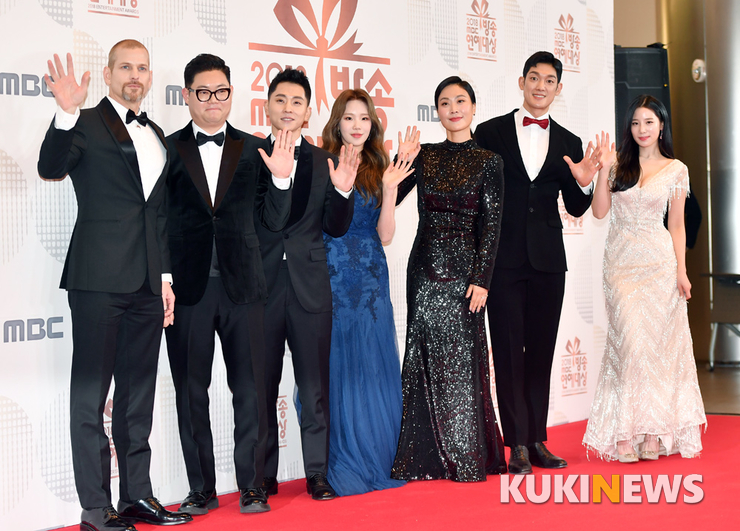 예능프로그램 '진짜 사나이 300'의 출연진 감스트, 김재화, 매튜 다우마, 안현수, 조현, 주이, 박재민이 29일 오후 서울 상암동 MBC 신사옥에서 열린 '2018 MBC 방송연예대상'에 참석해 포즈를 취하고 있다.