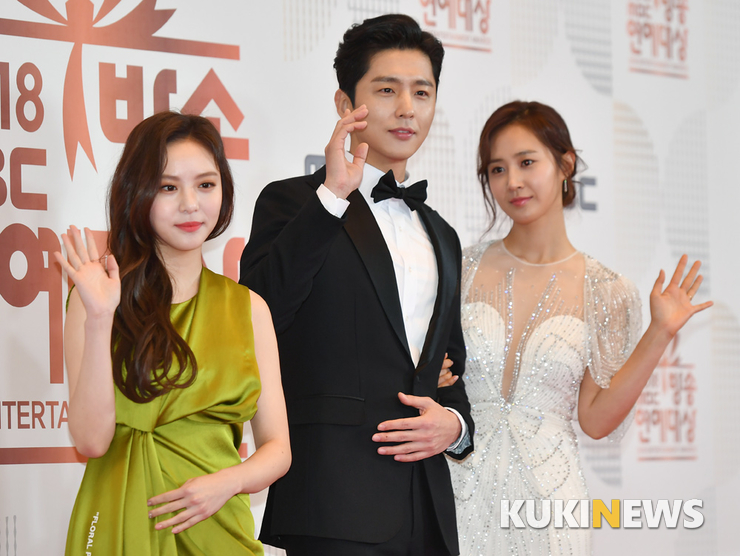 예능프로그램 '대장금이 돌아왔다'의 권유리, 신동욱 이열음이 29일 오후 서울 상암동 MBC 신사옥에서 열린 '2018 MBC 방송연예대상'에 참석해 포즈를 취하고 있다.