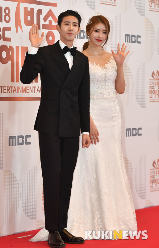 방송인 황광희와 그룹 러블리즈 멤버 미주가 29일 오후 서울 상암동 MBC 신사옥에서 열린 '2018 MBC 방송연예대상'에 참석해 포즈를 취하고 있다.