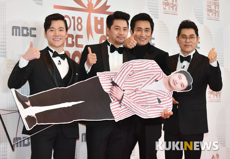 예능 프로그램 궁민남편에 출연 중인 조태관과 권오중, 차인표, 김용만이 29일 오후 서울 상암동 MBC 신사옥에서 열린 '2018 MBC 방송연예대상'에 참석해 포즈를 취하고 있다.