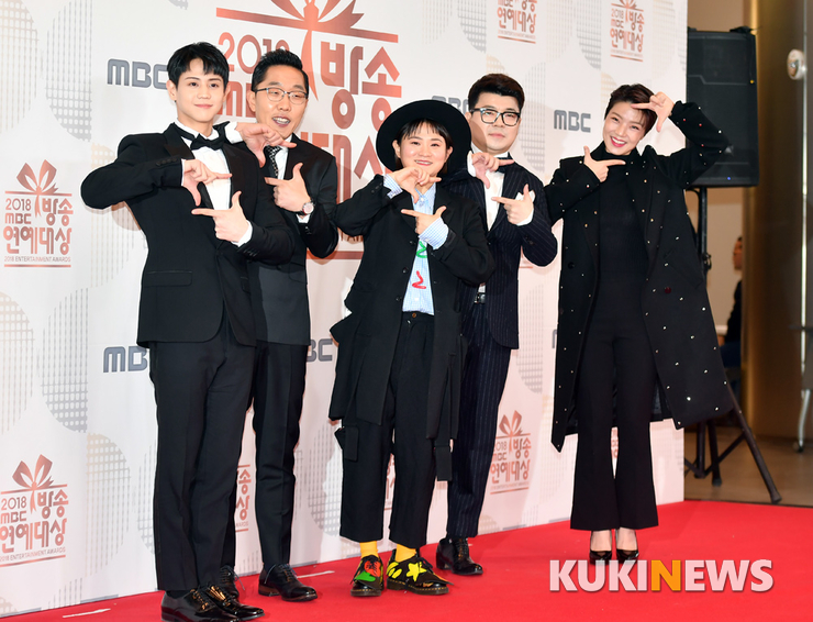 양요섭과 김제동, 김신영, 최욱, 안영미(사진 왼쪽부터)가 29일 오후 서울 상암동 MBC 신사옥에서 열린 '2018 MBC 방송연예대상'에 참석해 포즈를 취하고 있다.