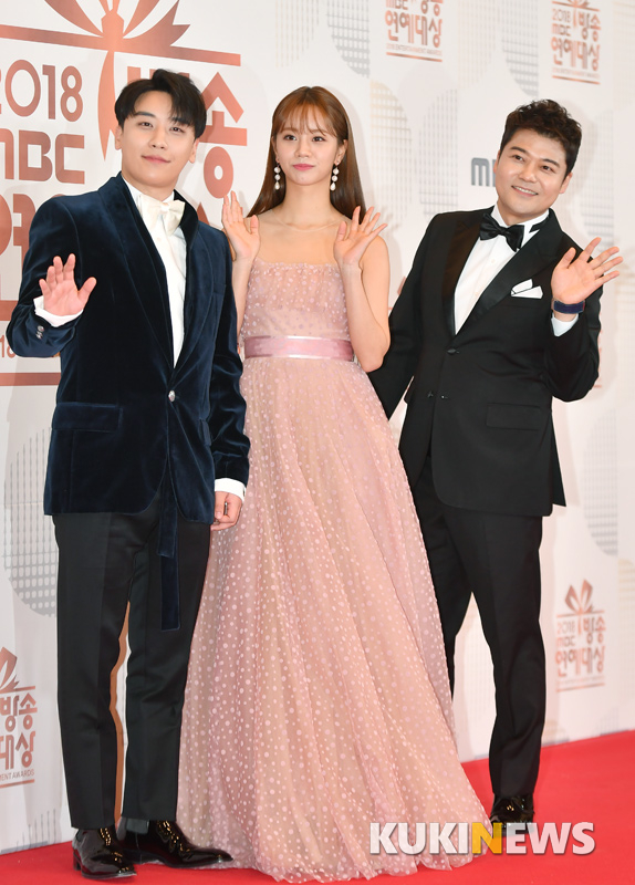 가수 승리와 혜리, 방송인 전현무가 29일 오후 서울 상암동 MBC 신사옥에서 열린 '2018 MBC 방송연예대상'에 참석해 포즈를 취하고 있다.