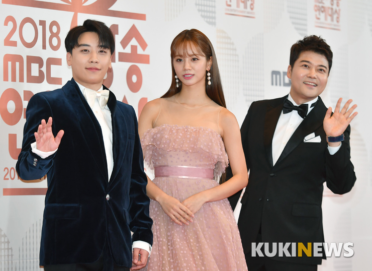 그룹 빅뱅 멤버 승리와 그룹 걸스데이 멤버 혜리, 방송인 전현무가 29일 오후 서울 상암동 MBC 신사옥에서 열린 '2018 MBC 방송연예대상'에 참석해 포즈를 취하고 있다.