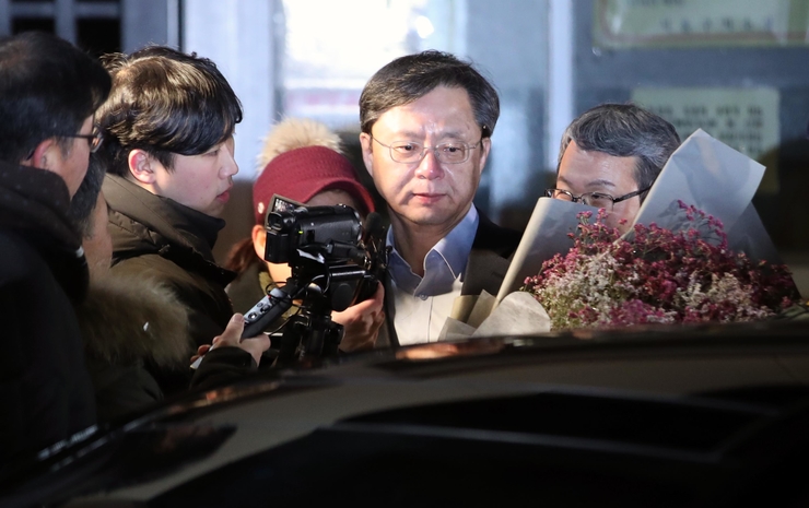 이날 오전 0시 8분쯤 경기도 의왕 서울구치소를 나선 우병우 전 수석은 기자들의 질문엔 아무런 대답을 하지 않았으나, 지지자가 축하 인사를 하며 꽃다발을 건네자 옅은 미소를 보였다.