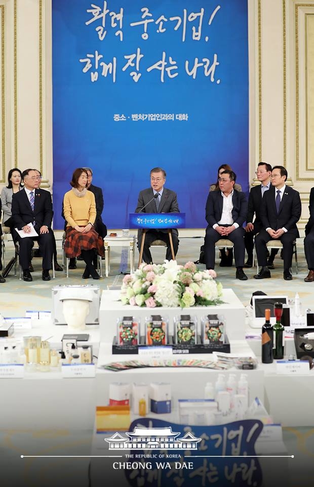 문재인 대통령이 7일 오후 청와대 영빈관에서 ‘활력 중소기업, 함께 잘사는 나라’라는 슬로건으로 열린 ‘중소ㆍ벤처 기업인과의 대화’에서 모두발언을 하고 있다.