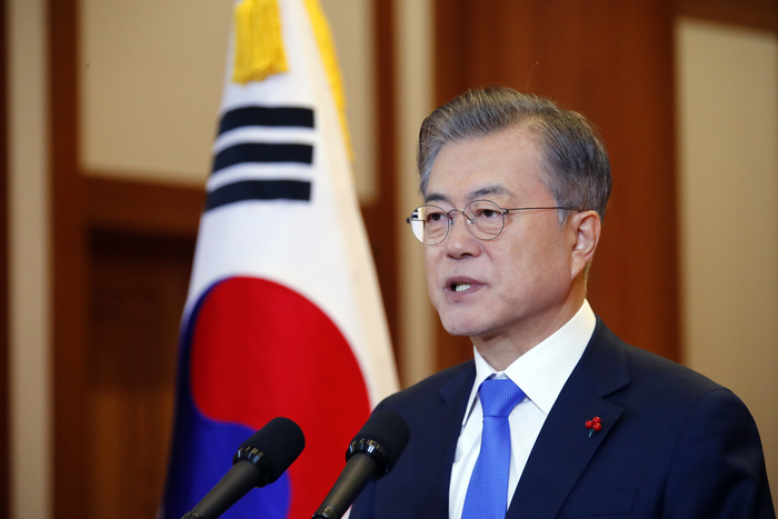 문재인 대통령이 10일 오전 청와대 본관에서 신년 기자회견을 앞두고 발표문을 낭독하고 있다.