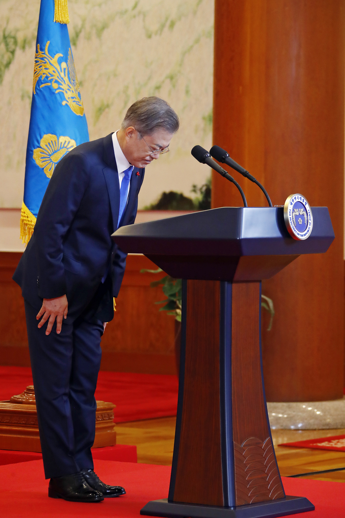 문재인 대통령이 10일 오전 청와대 본관에서 신년 기자회견을 앞두고 발표문을 낭독 후 인사하고 있다.