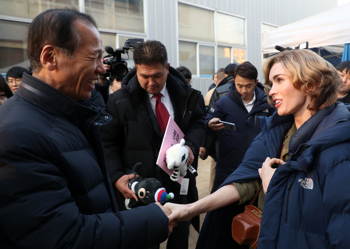 할리우드 배우 메간 폭스가 10일 강원 춘천시의 영화 촬영 현장에서 최문순 강원도지사로부터 수호랑·반다비 인형을 선물받고 있다. 메간 폭스는 영화 '장사리 9.15' 촬영을 위해 우리나라를 방문했다.