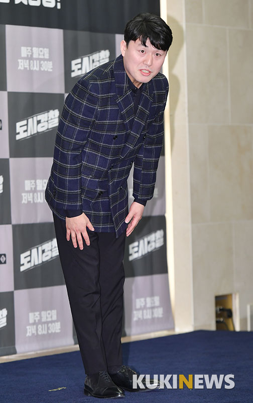 배우 김민재가 14일 서울 상암동 스탠포드호텔에서 열린 MBC에브리원 ‘도시경찰’ 제작발표회에 참석해 포즈를 취하고 있다.
