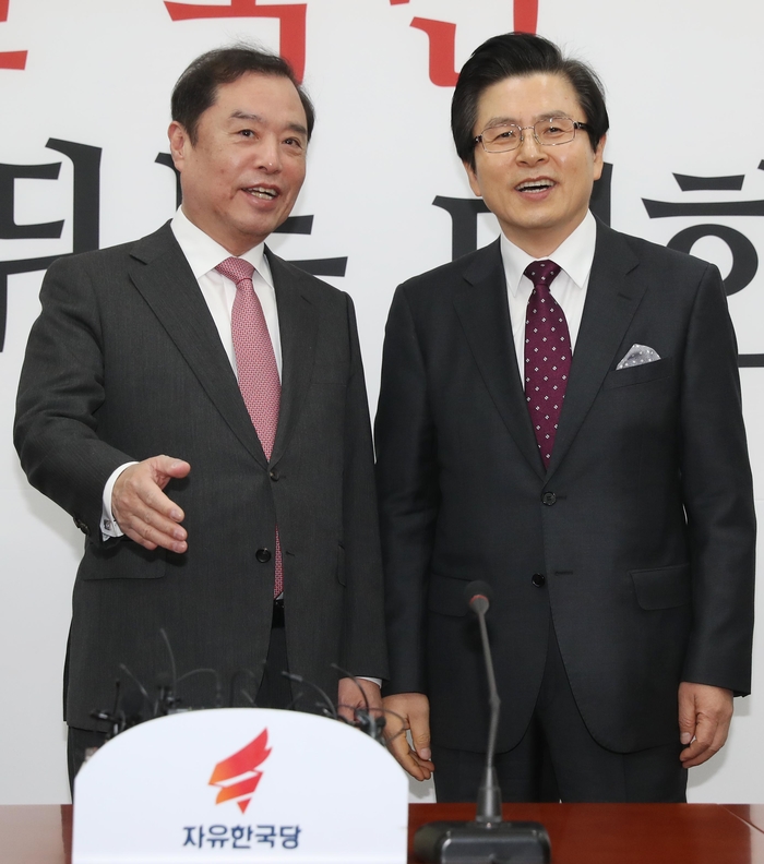 15일 오전 국회 본청 자유한국당 회의실에서 열린 황교안 전 국무총리의 입당식에서 황 전 총리와 김병준 비대위원장이 밝은 표정으로 얘기하고 있다.