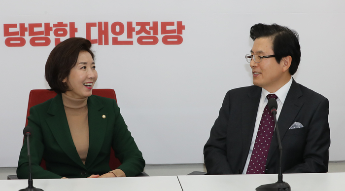 자유한국당에 입당한 황교안 전 국무총리(오른쪽)가 15일 오전 국회 본청 원내대표실에서 나경원 원내대표와 면담하고 있다.