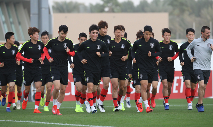 파울루 벤투 감독이 이끄는 축구 국가대표팀이 19일 오후(현지시간) 아랍에미리트 두바이 NAS 스포츠 콤플렉스에서 몸을 풀고 있다.