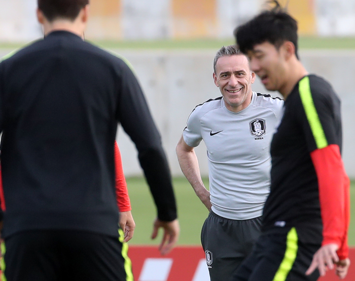 파울루 벤투 한국 축구 국가대표감독이 19일 오후(현지시간) 아랍에미리트 두바이 NAS 스포츠 콤플렉스에서 바레인과의 16강전을 앞두고 몸을 풀고 있는 손흥민을 바라보며 흐뭇한 표정을 짓고 있다.