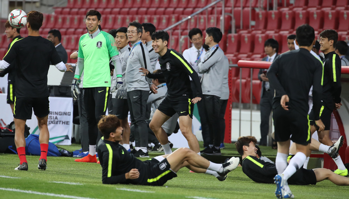 축구대표팀이 21일(현지시각) 2019 아시아축구연맹(AFC) 아시안컵 바레인과의 16강전을 하루 앞두고 아랍에미리트 두바이 라시드 스타디움에서 몸을 풀고 있다.