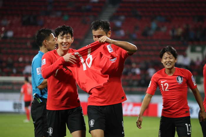 연장 전반 김진수가 골을 넣자 손흥민과 지동원이 부상으로 조기 복귀한 기성용의 유니폼을 들고 기뻐하고 있다.