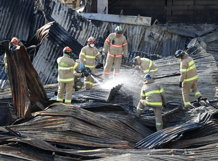 24일 오전 울산시 남구 농수산물도매시장 수산물종합동이 화재로 타 지붕이 내려앉고 뼈대만 남은 가운데 소방대원들이 현장을 살피고 있다.