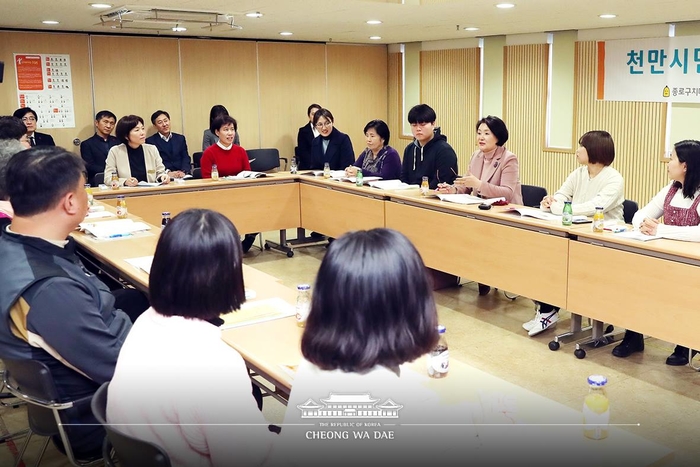 김정숙 여사가 23일 서울 종로구 치매 안심센터를 방문해 관계자들과 이야기를 나누고 있다.