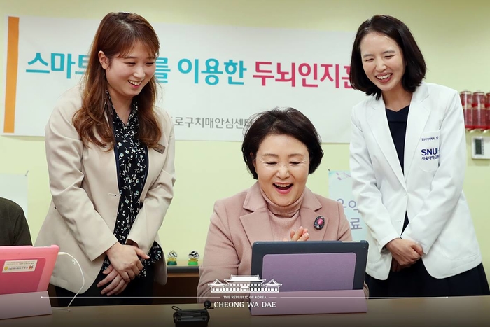 김정숙 여사가 23일 오후 서울 종로구 치매 안심센터를 방문해 어르신을 위한 컴퓨터 이용 치매예방 프로그램을 참관하고 있다.
