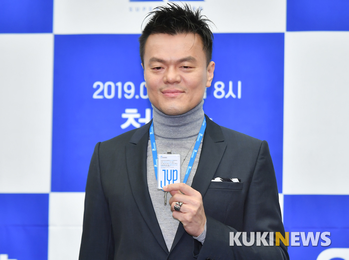 JYP엔터테인먼트 박진영 CCO가 24일 오후 서울 상암동 스탠포드호텔에서 열린 Mnet '슈퍼인턴' 제작발표회에 참석해 포즈를 취하고 있다.
