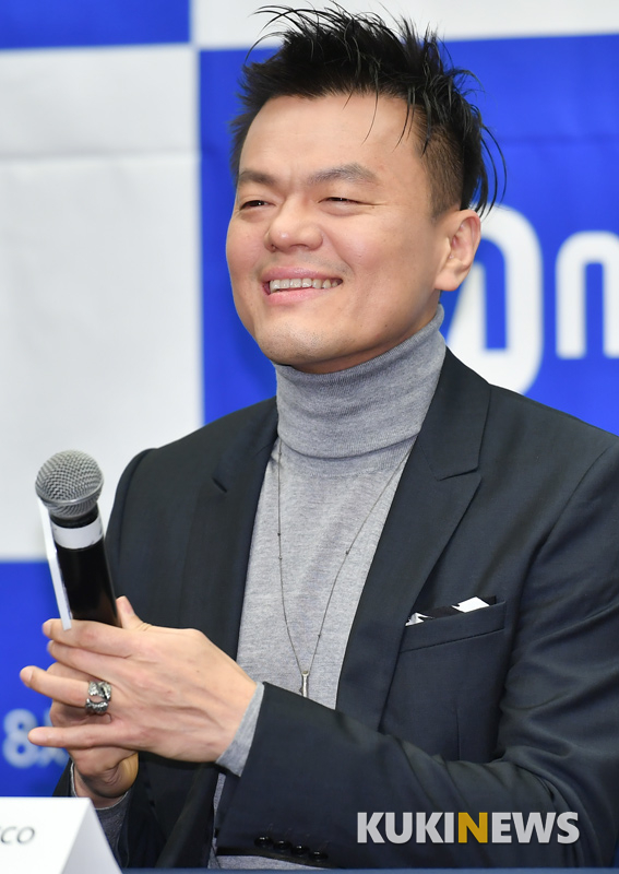 JYP엔터테인먼트 박진영 CCO가 24일 오후 서울 상암동 스탠포드호텔에서 열린 Mnet '슈퍼인턴' 제작발표회에 참석해 인사하고 있다.