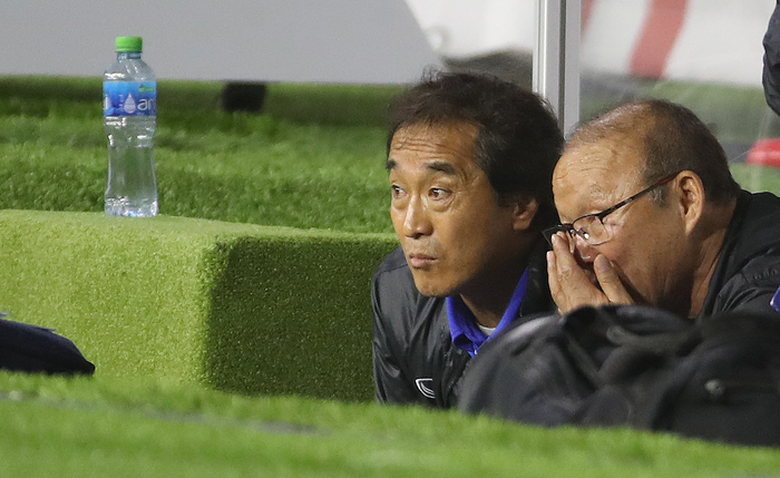 박항서 베트남 축구대표팀 감독(오른쪽)과 이영진 코치가 24일 오후(현지시간) 아랍에미리트 두바이 알 막툼 경기장에서 열린 2019 아시아축구연맹(AFC)아시안컵 베트남과 일본의 8강전에서 굳은 표정으로 경기를 지켜보고 있다.