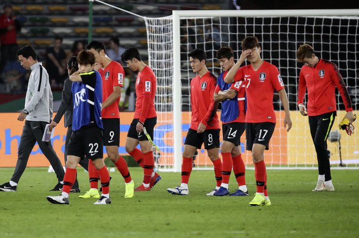 대한민국 축구 대표팀이 25일 오후(현지시간) 아랍에미리트 아부다비 자예드 스포츠시티 스타디움에서 2019 아시아축구연맹(AFC)아시안컵 8강전 카타르와의 경기에서 0-1로 패배 후 아쉬워하고 있다.