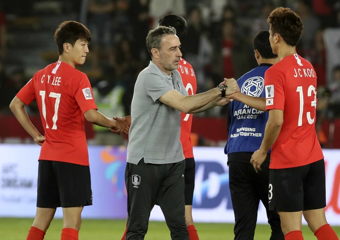 대한민국 축구 대표팀이 25일 오후(현지시간) 아랍에미리트 아부다비 자예드 스포츠시티 스타디움에서 2019 아시아축구연맹(AFC)아시안컵 8강전 카타르와의 경기에서 0-1로 패배 후 아쉬워하고 있다.