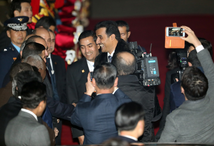 타밈 빈 하마드 알사니 카타르 국왕이 27일 성남 서울공항을 통해 입국하고 있다. 문재인 대통령은 이날부터 1박 2일 일정으로 공식 방한하는 타밈 빈 하마드 알사니 카타르 국왕과 28일 정상회담을 한다.