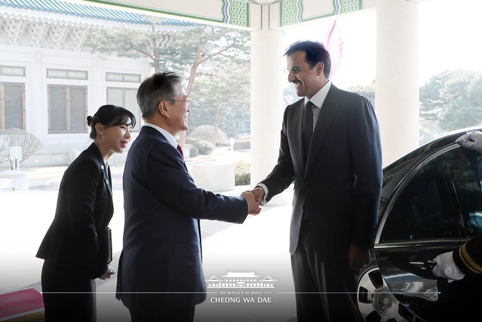 문재인 대통령이 28일 오전 한국을 공식 방문중인 타밈 빈 하마드 알사니 카타르 국왕이 청와대에 도착하자 영접하고 있다.