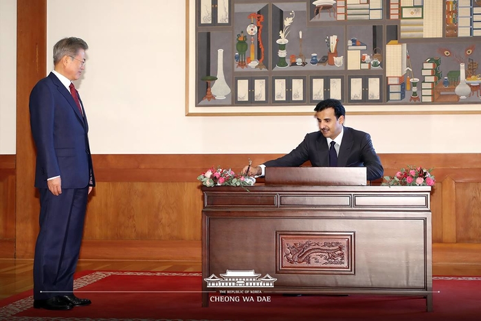 문재인 대통령이 28일 오전 한국을 공식 방문중인 타밈 빈 하마드 알사니 카타르 국왕이 청와대에 도착하자 영접하고 있다.