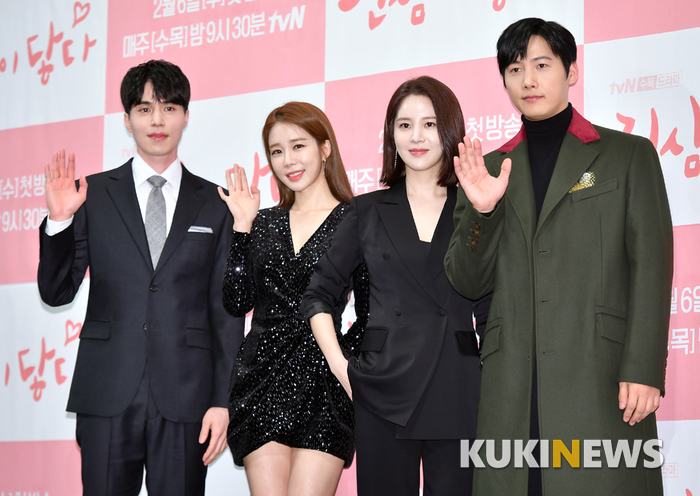 배우 이동욱과 유인나, 손성윤, 이상우가 29일 오후 서울 언주로 임피리얼팰리스에서 열린 tvN 새 수목드라마 ‘진심이 닿다’ 제작발표회에 참석해 포즈를 취하고 있다.