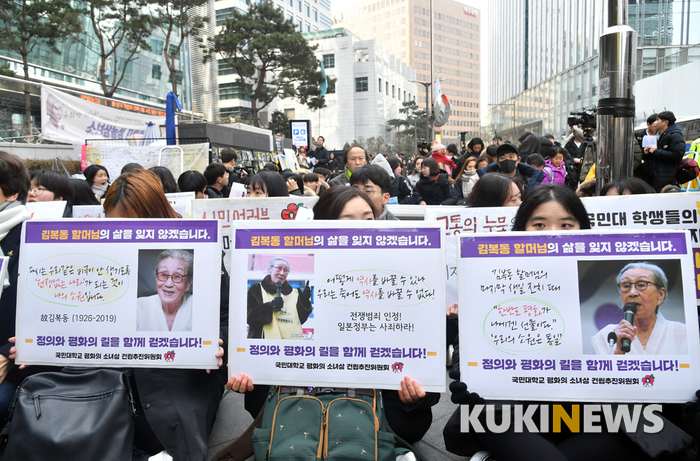 30일 서울 종로구 옛 일본대사관 앞에서 열린 일본군 성노예제 문제해결을 위한 제1372차 수요집회에서 참가자들이 팻말을 들고 있다.