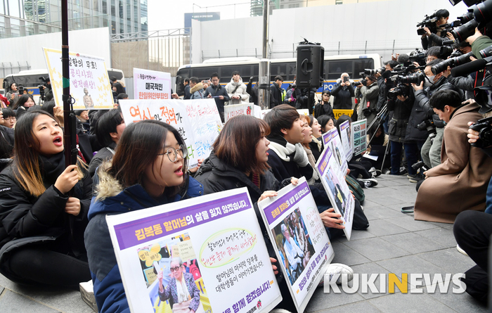 30일 서울 종로구 옛 일본대사관 앞에서 열린 일본군 성노예제 문제해결을 위한 제1372차 수요집회에서 참가자들이 팻말을 들고 구호를 외치고 있다.