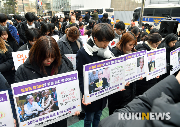 30일 서울 종로구 옛 일본대사관 앞에서 열린 일본군 성노예제 문제해결을 위한 제1372차 수요집회에서 참가자들이 故 김복동 할머니를 추모하며 묵념하고 있다.