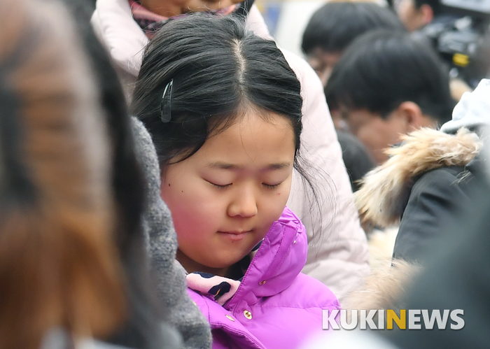 30일 서울 종로구 옛 일본대사관 앞에서 열린 일본군 성노예제 문제해결을 위한 제1372차 수요집회에서 한 어린이가 故 김복동 할머니를 추모하며 묵념하고 있다.