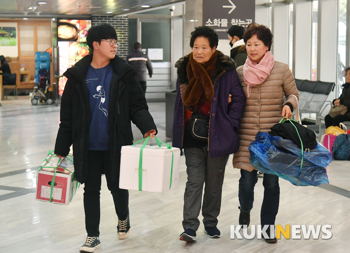설 연휴를 앞둔 31일 오후 서울 서초구 반포동 센트럴시티터미널에서 역귀성 하는 어르신이 가족과 발걸음을 옮기고 있다.