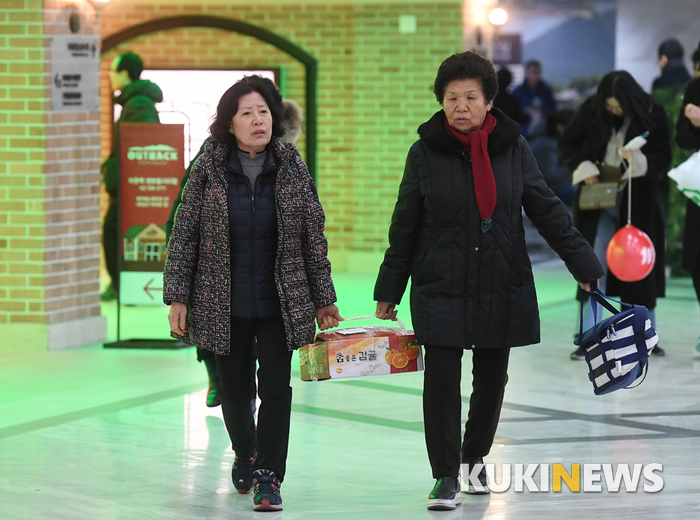 설 연휴를 앞둔 31일 오후 서울 서초구 반포동 센트럴시티터미널에서 역귀성 하는 어르신이 가족들을 만나 발걸음을 재촉하고 있다.