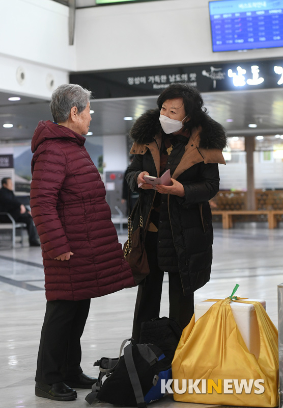 설 연휴를 앞둔 31일 오후 서울 서초구 반포동 센트럴시티터미널에서 역귀성 하는 어르신이 가족들을 만나 인사하고 있다.