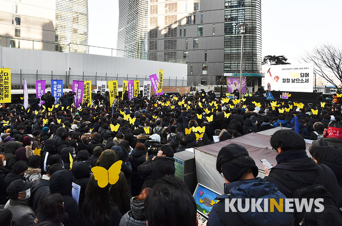 1일 오전 서울 종로구 옛 일본대사관 앞에서 열린 일본군위안부 피해자 김복동 할머니의 영결식에서 상주단으로 참석한 시민들이 슬픔에 잠겨있다.