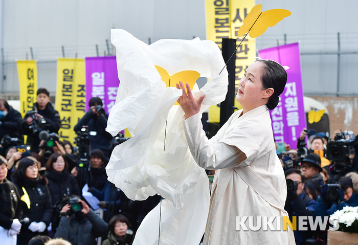 장순향 한국민족춤협회 회장 1일 오전 서울 종로구 옛 일본대사관 앞에서 열린일본군위안부 피해자 김복동 할머니의 영결식에서 살풀이 추모 공연을 하고 있다.