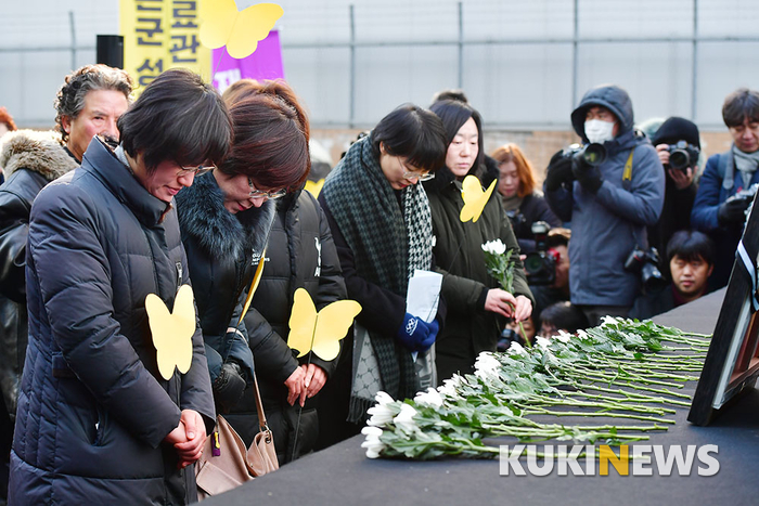 1일 오전 서울 종로구 옛 일본대사관 앞에서 열린일본군위안부 피해자 김복동 할머니의 영결식에서 시민들이 묵념하고 있다.